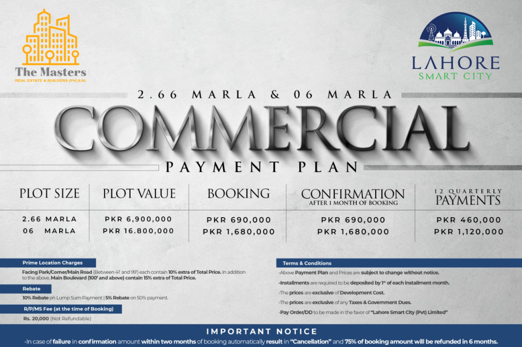 The booking process for the Lahore Smart City is straightforward. However, it is more convenient when you get it done with The Masters Real Estate & Builders. Our team of experts is always ready to guide you through the whole procedure, and they will lead you from the beginning until the end of the process.